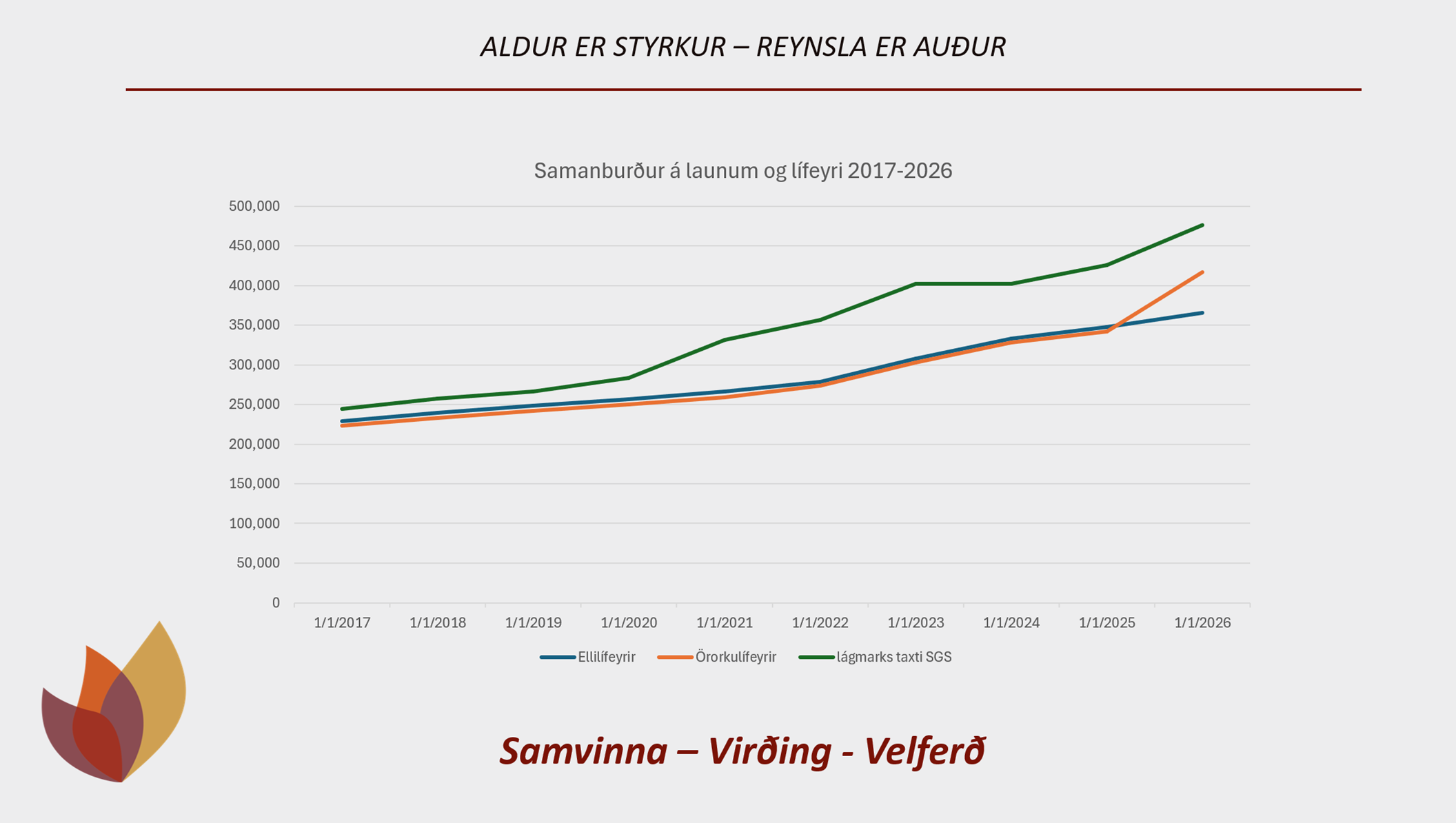 Þann 1. Janúar 2017 var munurinn á milli lægsta taxta SGS og grunnlífeyris kr. 51.266.-