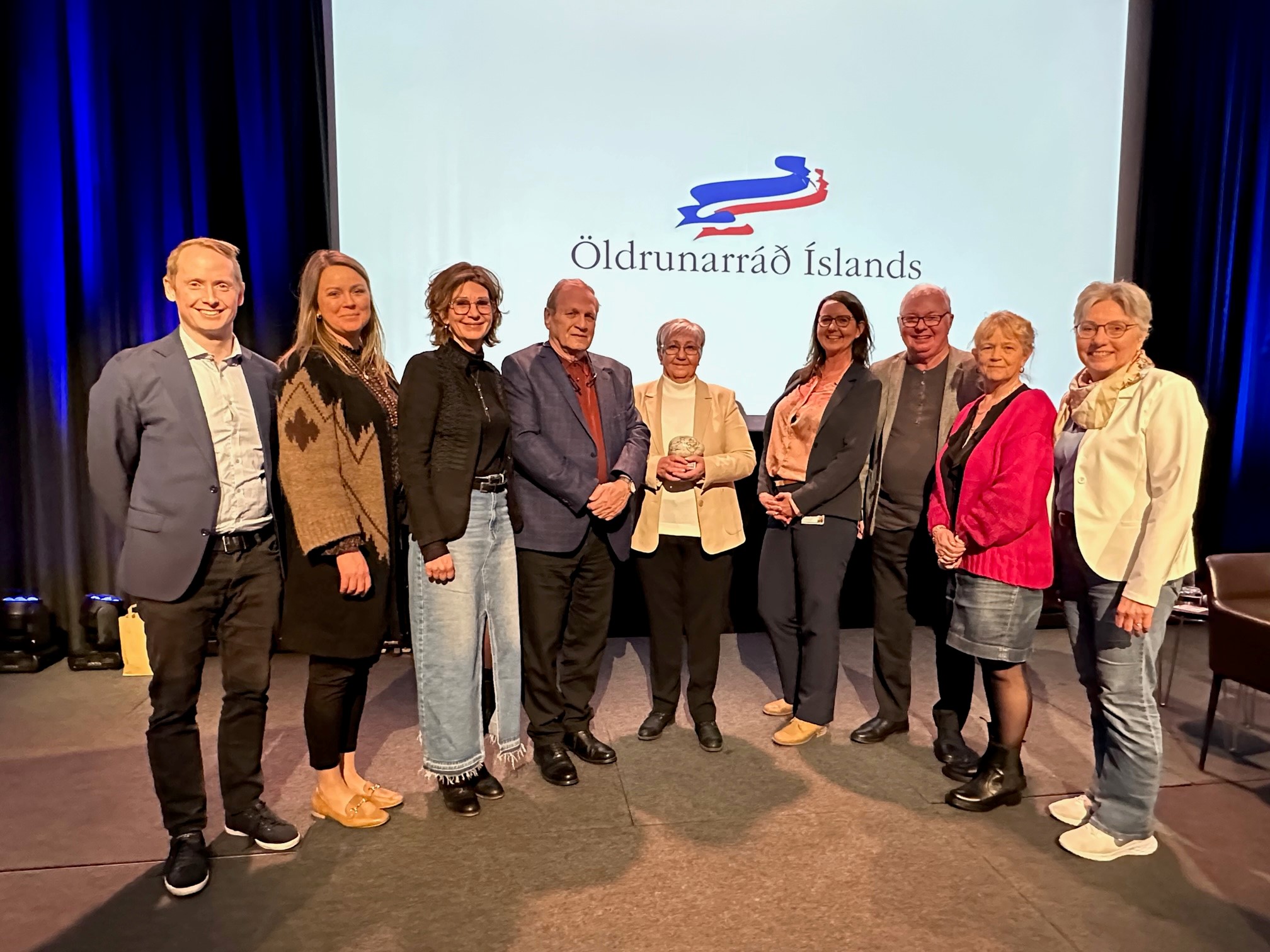 Stjórn Öldrunarráðs og viðtakendur fjöreggsins, frá vinstri, Aríel Pétursson, Birna Sif Atladóttir, Jórunn Frímannsdóttir Jensen, Þór Vilhjálmssson, Sólveig Adolfsdóttir, Andrea Laufey Jónsdóttir, Helgi Pétursson, Margrét Árdís Ósvaldsdóttir og Þórhildur Guðrún Egilsdóttir.